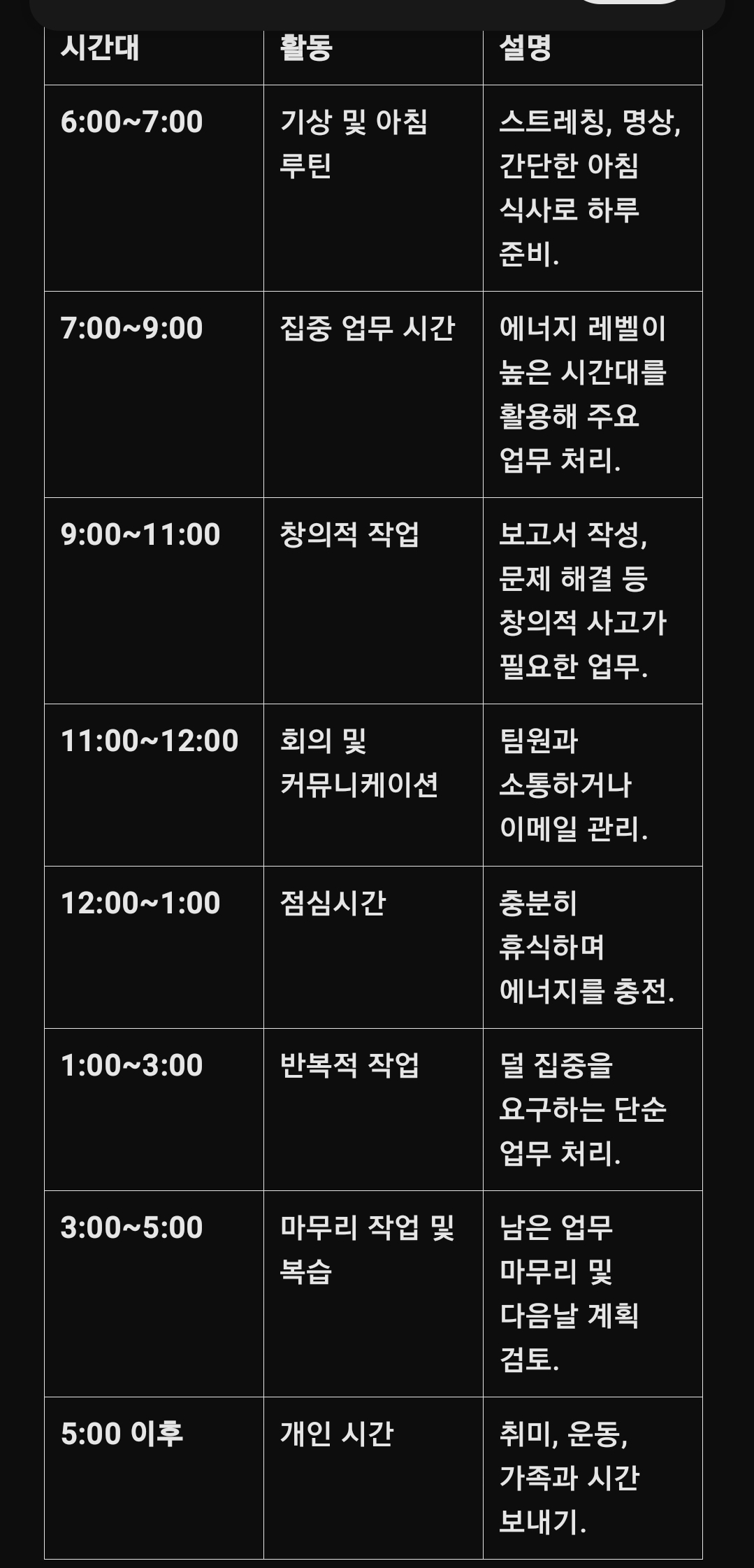 사례: 주요 업무는 오전에 처리하고, 덜 중요한 이메일은 오후에 검토.