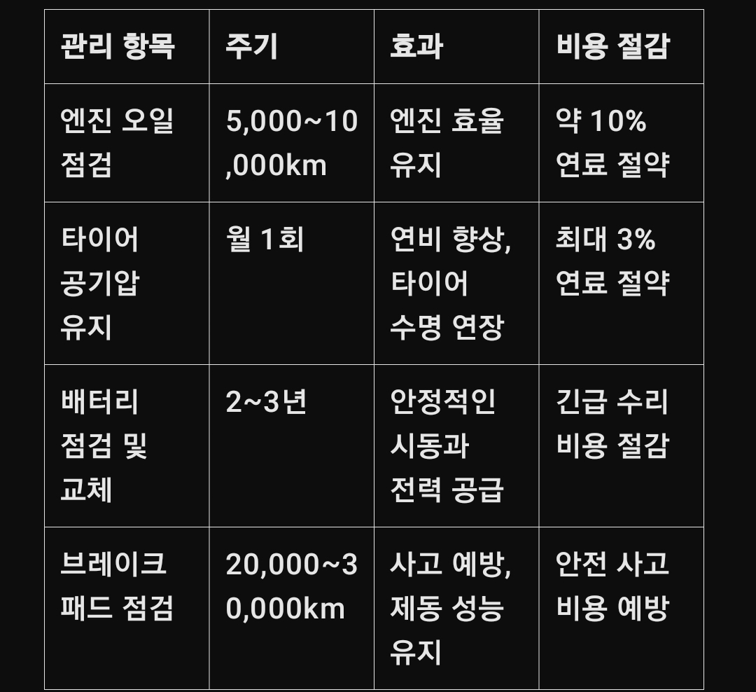 효율적인 차량 관리는 시간과 비용을 절약하며, 안전한 주행 환경을 제공합니다. 위의 팁을 참고하여 차량을 정기적으로 관리하고 연료를 절약하세요. 추가로 궁금한 점이 있다면 언제든 문의해 주세요!