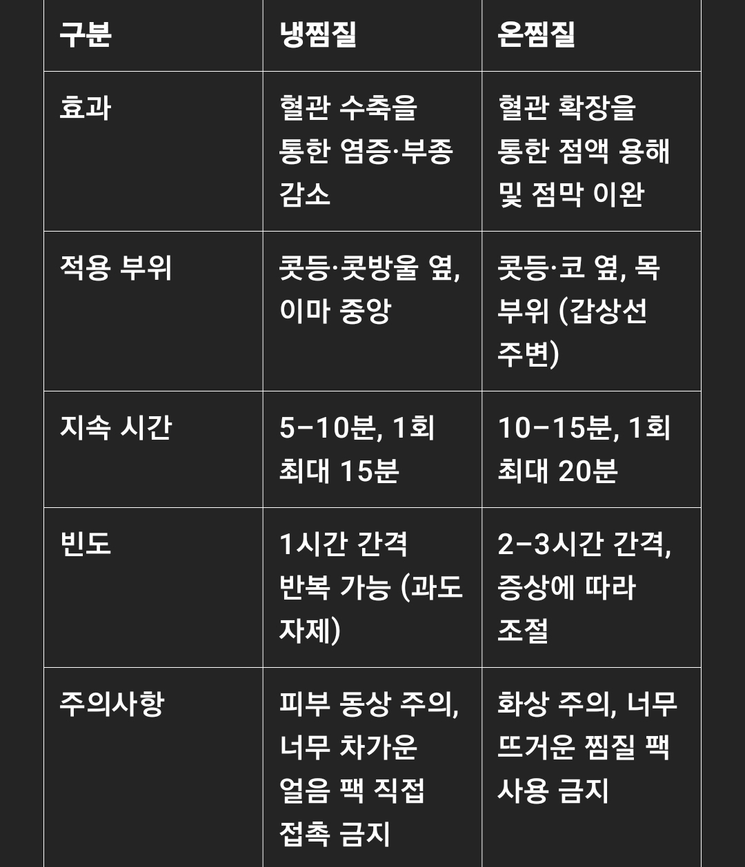 교차 방법: 온찜질 1분 → 냉찜질 30초 → 온찜질 1분, 총 3세트