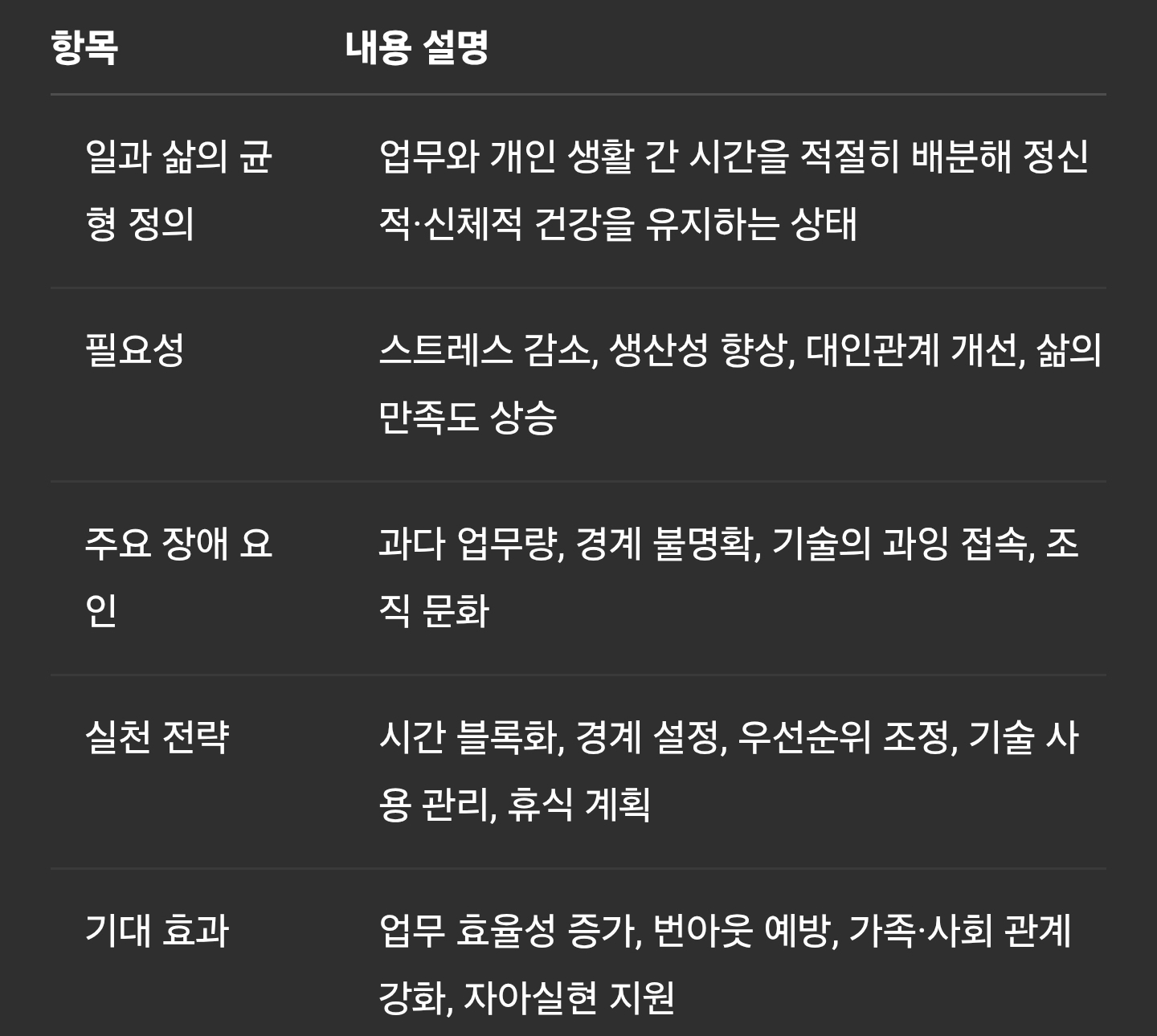 실천 전략 시간 블록화, 경계 설정, 우선순위 조정, 기술 사용 관리, 휴식 계획