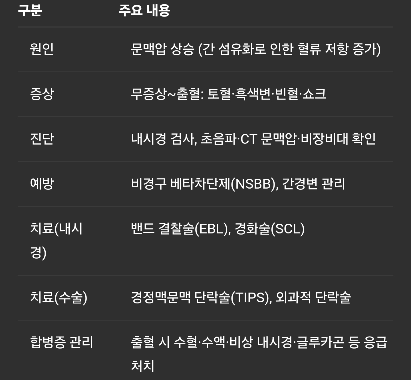 간경변으로 인한 정맥류는 문맥압 상승이 근본 원인으로, 무증상 상태에서 갑작스러운 출혈로 발전할 수 있습니다. NSBB 투여와 간경변 관리를 통한 예방, 정기 내시경 스크리닝을 통해 조기 발견하고, EBL·SCL, TIPS 등 치료를 적절히 시행해야 합니다. 출혈 발생 시 응급 지혈과 수혈로 신속히 대응하고, 지속적인 간경변 관리로 재발을 방지하시길 바랍니다. 감사합니다.