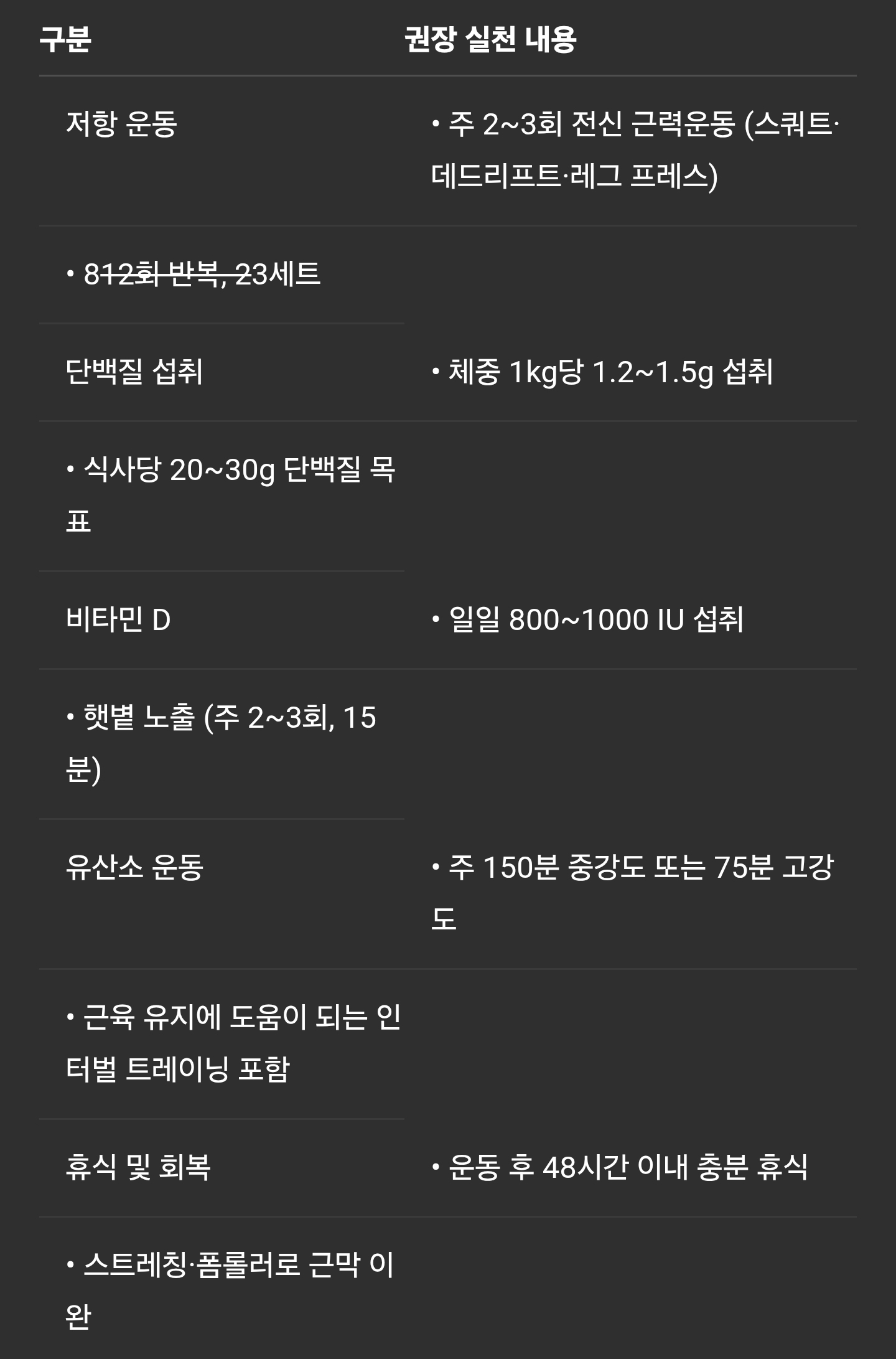 사코페니아 예방과 근육량 유지를 위해 저항 운동, 충분한 단백질 섭취, 비타민 D 보충, 유산소 운동, 휴식·회복, 대사·호르몬 관리가 종합적으로 필요합니다. 제시된 전략을 일상에 적용해 근육 기능을 유지하시길 바랍니다. 감사합니다.