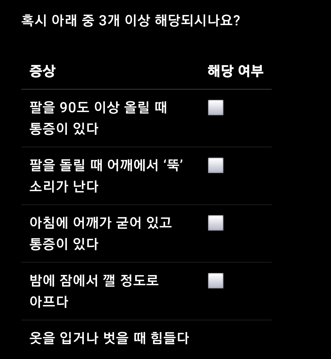 아침에 어깨가 굳어 있고 통증이 있다 ⬜