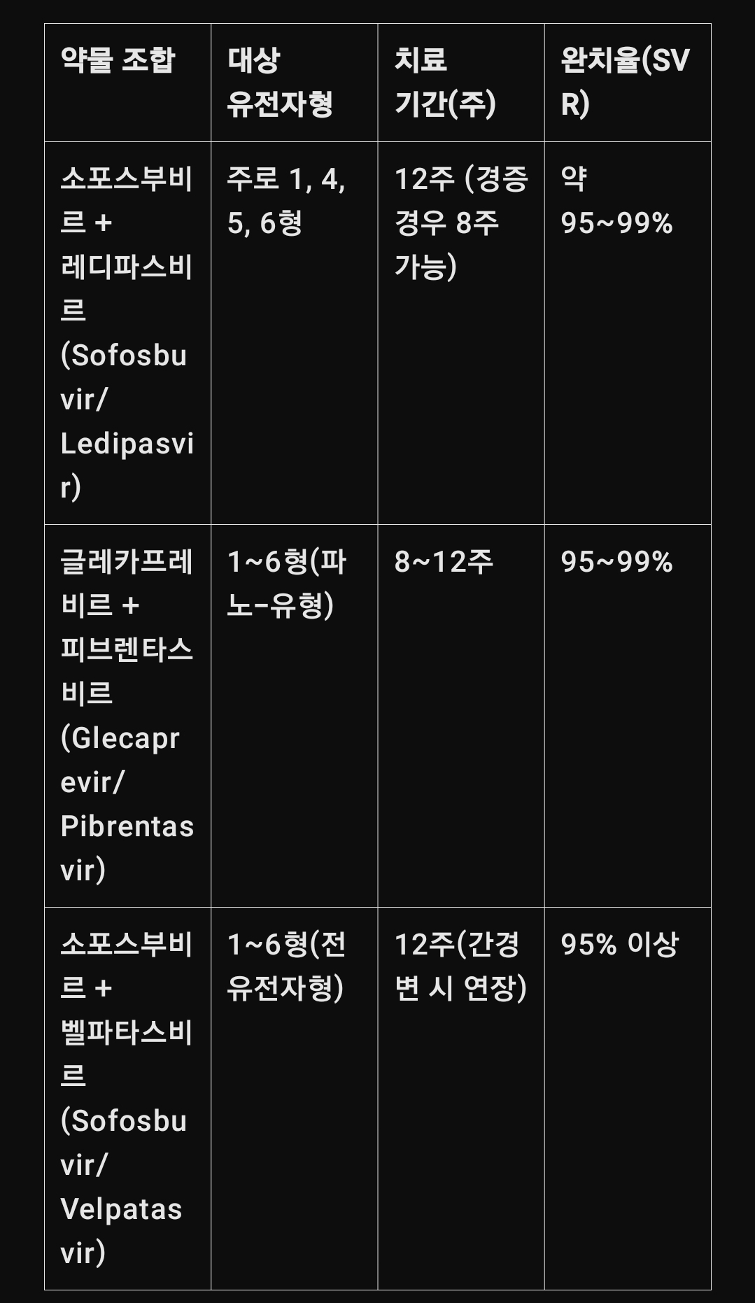 > 주의: 본 글은 C형 간염 치료(특히 최신 Direct-Acting Antivirals, DAA 등)에 관한 일반적인 의학·건강 정보를 제공하기 위한 것이며, 개인의 건강 상태, 유전적 요인, 기저 질환, 간 상태(섬유화 정도), 감염된 C형 간염 유전자형 등에 따라 치료법과 예후는 달라질 수 있습니다. 치료를 고려하거나 증상이 나타날 경우, 반드시 전문 의료진(간내과, 감염내과 등)과 상담하여 정확한 진단과 적절한 치료 계획을 세우셔야 합니다.