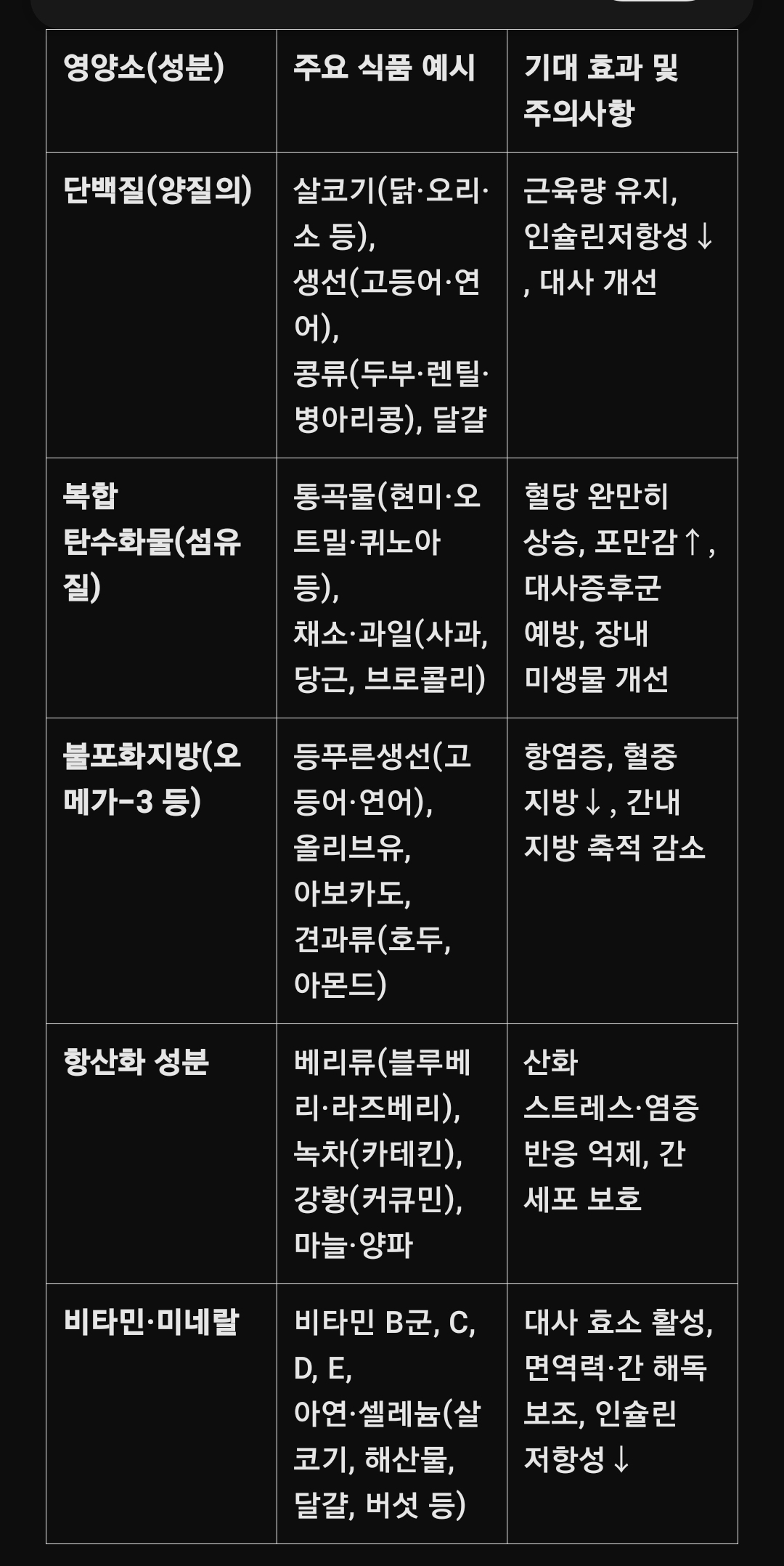 단백질(살코기, 생선, 두부, 콩류)은 근육 유지·인슐린 저항성 개선. 과도한 붉은 고기, 가공육은 제한