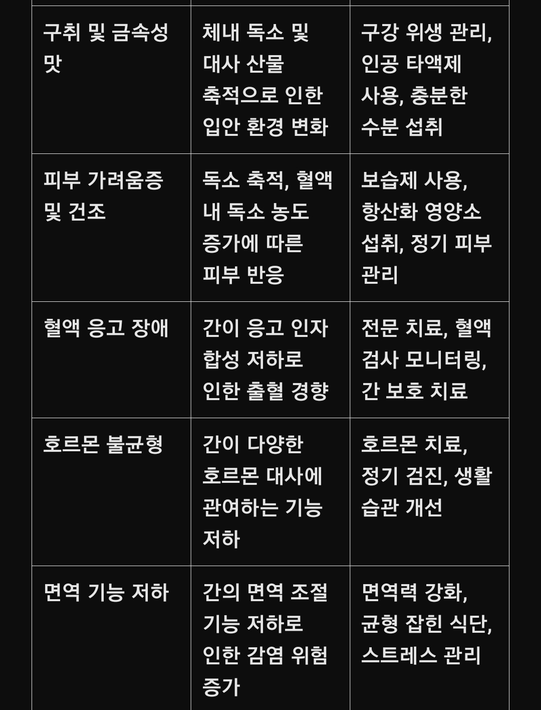 ⅩⅣ. 아래는 간 기능 저하 시 나타나는 주요 증상과 이를 예방 또는 개선하기 위한 방법을 요약한 간단한 표이다.