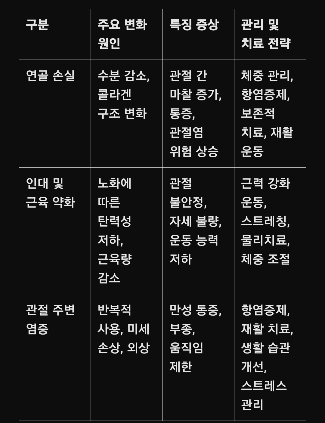 위 표는 노화로 인한 무릎의 구조 변화와 그에 따른 증상, 그리고 각각의 관리 및 치료 전략을 한눈에 이해할 수 있도록 정리한 자료입니다.