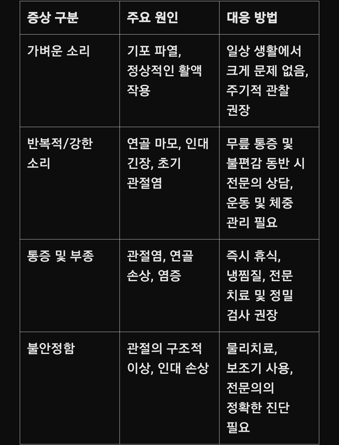 아래의 표는 무릎에서 나는 소리의 주요 원인과 증상, 그리고 이에 따른 조치 방법을 간단하게 정리한 것입니다. 이 표를 참고하셔서 본인의 무릎 상태를 점검하고, 필요시 적절한 조치를 취하시길 바랍니다.