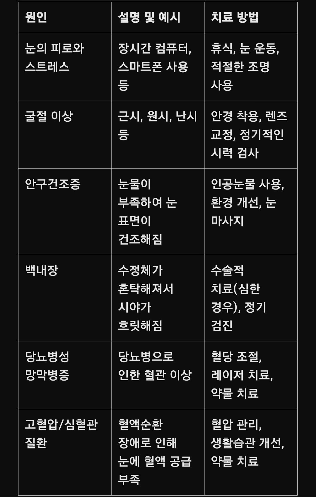 다음은 눈 시야가 흐려지는 주요 원인과 그에 따른 치료 방법을 한눈에 정리한 표예요.