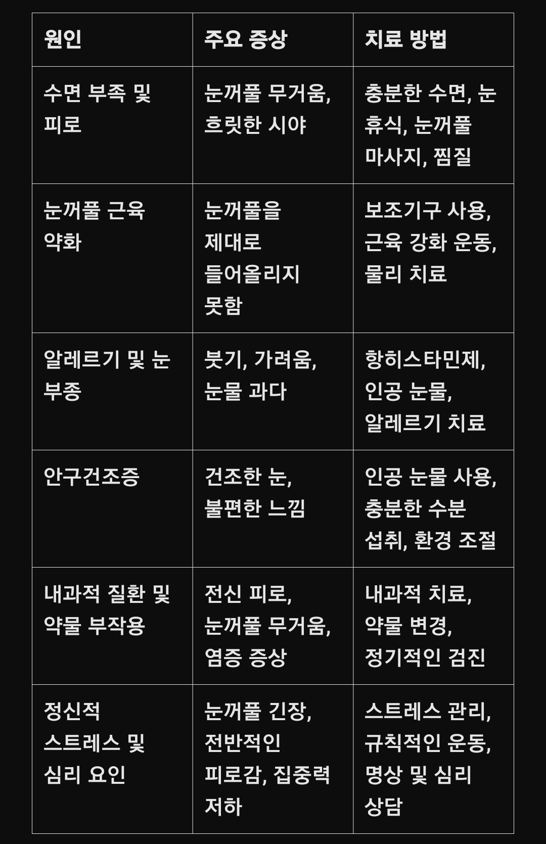 아래 표는 눈이 잘 안 뜨는 주요 원인과 각각에 따른 치료 방법을 한눈에 정리한 내용입니다.