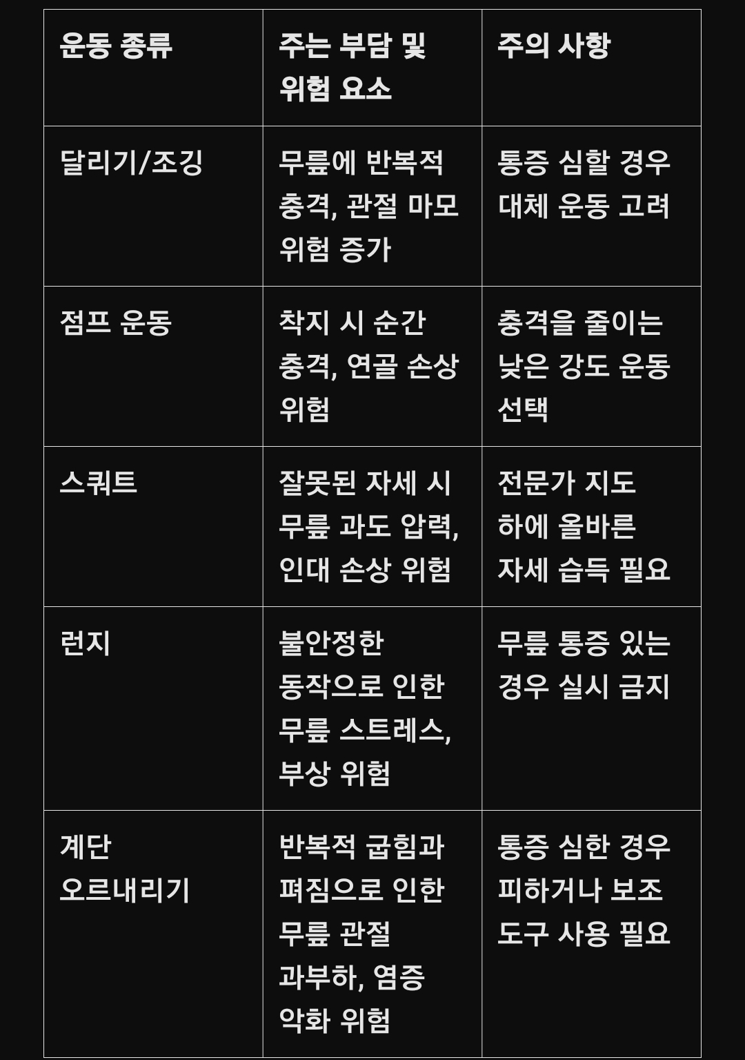 이 표를 참고하면, 각 운동이 무릎에 어떤 위험을 주는지 한눈에 쉽게 파악할 수 있어요.