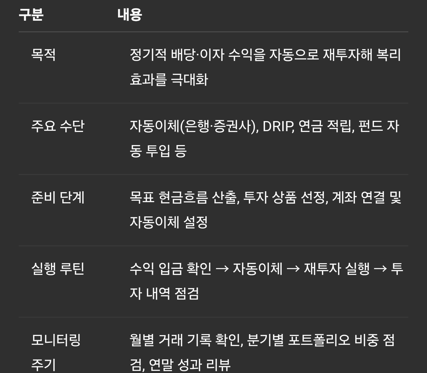 꾸준한 현금흐름을 위한 자동이체 재투자■ 요약 정리 표구분 내용목적 정기적 배당·이자 수익을 자동으로 재투자해 복리 효과를 극대화주요 수단 자동이체(은행·증권사), DRIP, 연금 적립, 펀드 자동 투입 등준비 단계 목표 현금흐름 산출, 투자 상품 선정, 계좌 연결 및 자동이체 설정실행 루틴 수익 입금 확인 → 자동이체 → 재투자 실행 → 투자 내역 점검모니터링 주기 월별 거래 기록 확인, 분기별 포트폴리오 비중 점검, 연말 성과 리뷰---서론 – 자동 재투자로 만드는 꾸준한 현금흐름 엔진현금흐름은 투자자의 재무 안정성의 핵심입니다. 그러나 배당금·이자 수익을 수동으로 재투자하다 보면 시장 타이밍 실패와 투자 기회 상실이 발생하기 쉽습니다. 자동이체를 통한 재투자 루틴을 마련하면, 귀찮음 없이도 자동적으..